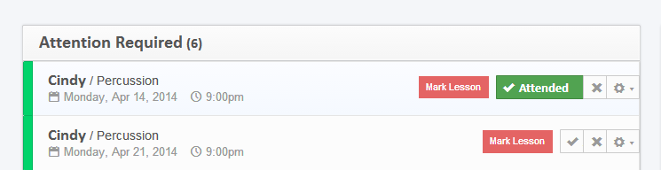 Lessons for your students on recurring schedules will automatically show up on your TakeLessons calendar. For any students on the flexible Schedule As You Go plan, you'll add lessons to your calendar manually through your account. Once the date and time of your lesson has passed, it will appear in the Attention Required section of your Dashboard."